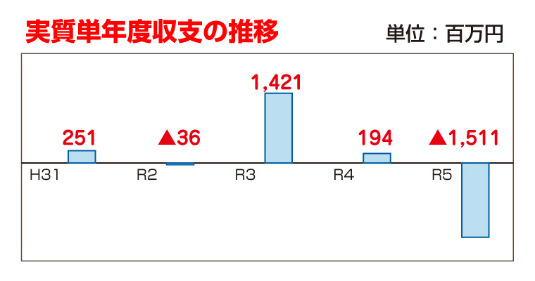 実質単年度収支が赤字になりましたが、【赤字】の言葉には、市民の皆様のイメージとしては、経営状況が悪いことを連想されると思いますが、自治体では営利を目的としていないため決してそのような状況ではなく、むしろ黒字が続けばよい状況にあるとも言えません。黒字もあり赤字の年もあるような状況が繰り返されていれば、財政としては通常な運営といえます。