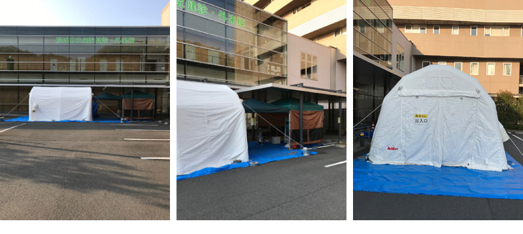 健康プラザ前駐車場に陰圧テントの設置と検診センター内の専用CT室の使用で、医師の判断によりPCR検査とCT画像診断を実施します。